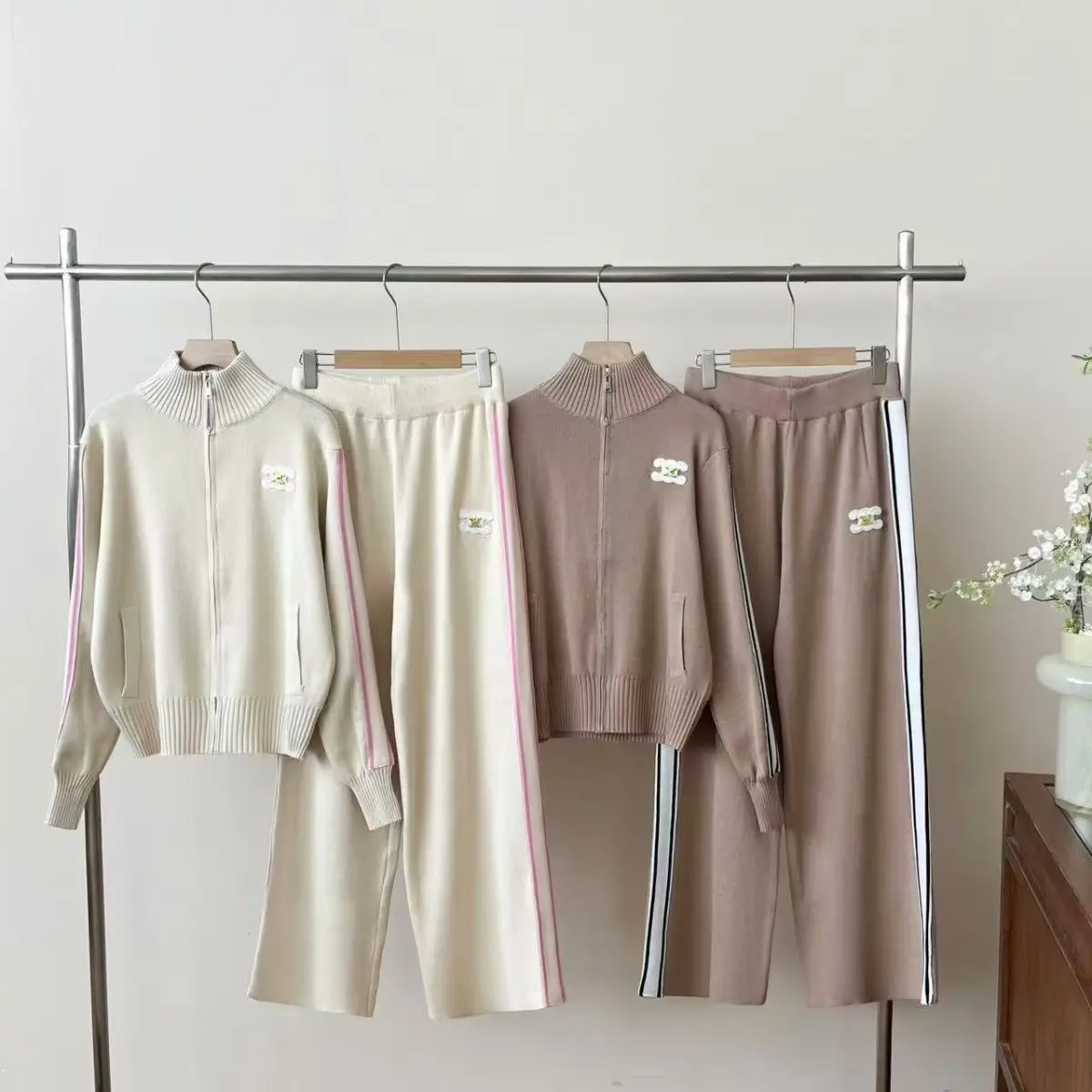 2024 new slim fit knitted two-piece sports style zipper top and wide leg pants multifunctional high-end set new repair