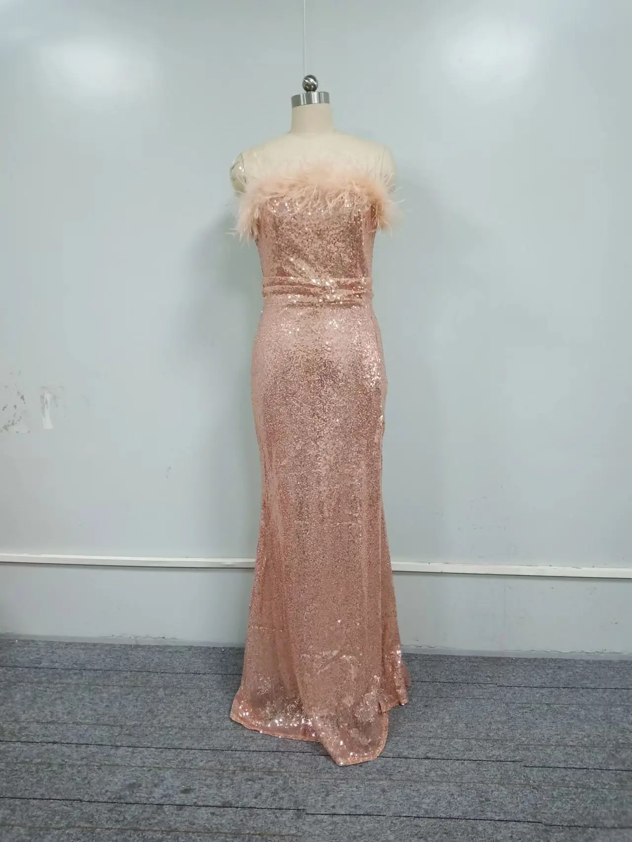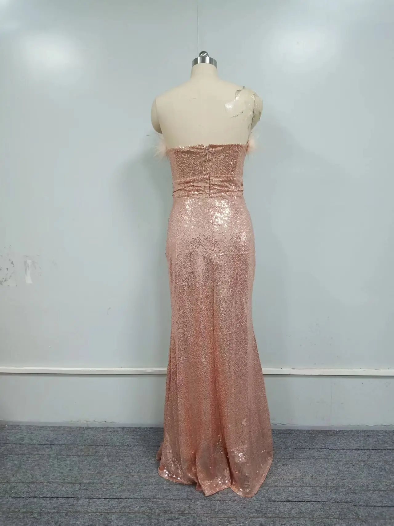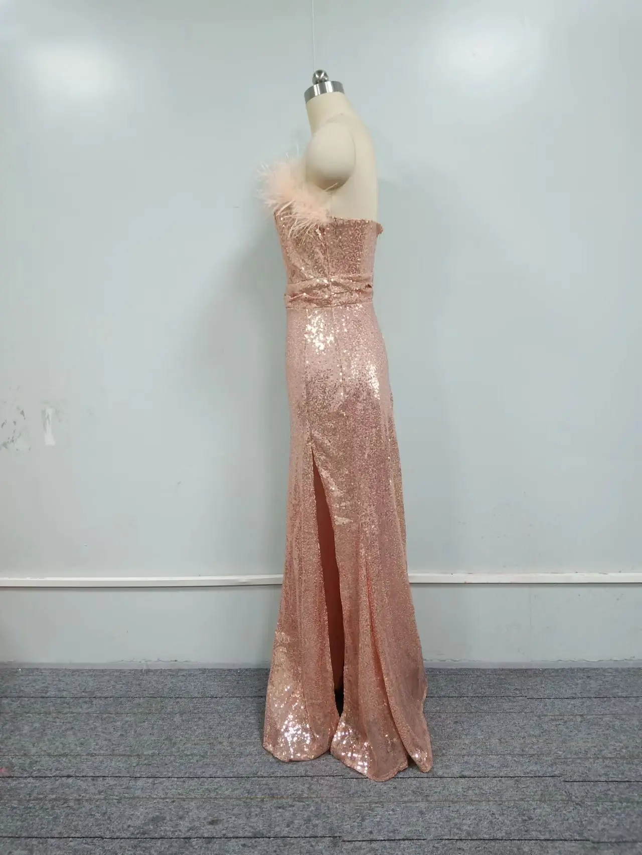 Be the first to review “2025 New Fashion Sequined Feather Maix Dress for Women Elegant Off Shoulder Backless Slit Side Slim Banquet Evening Dresses”