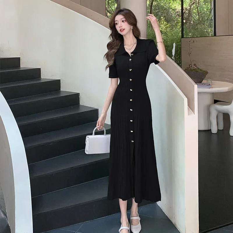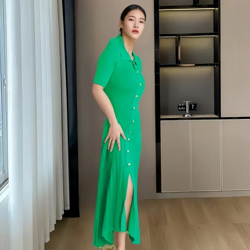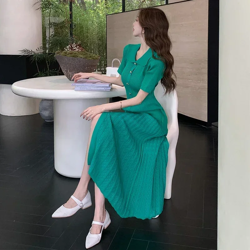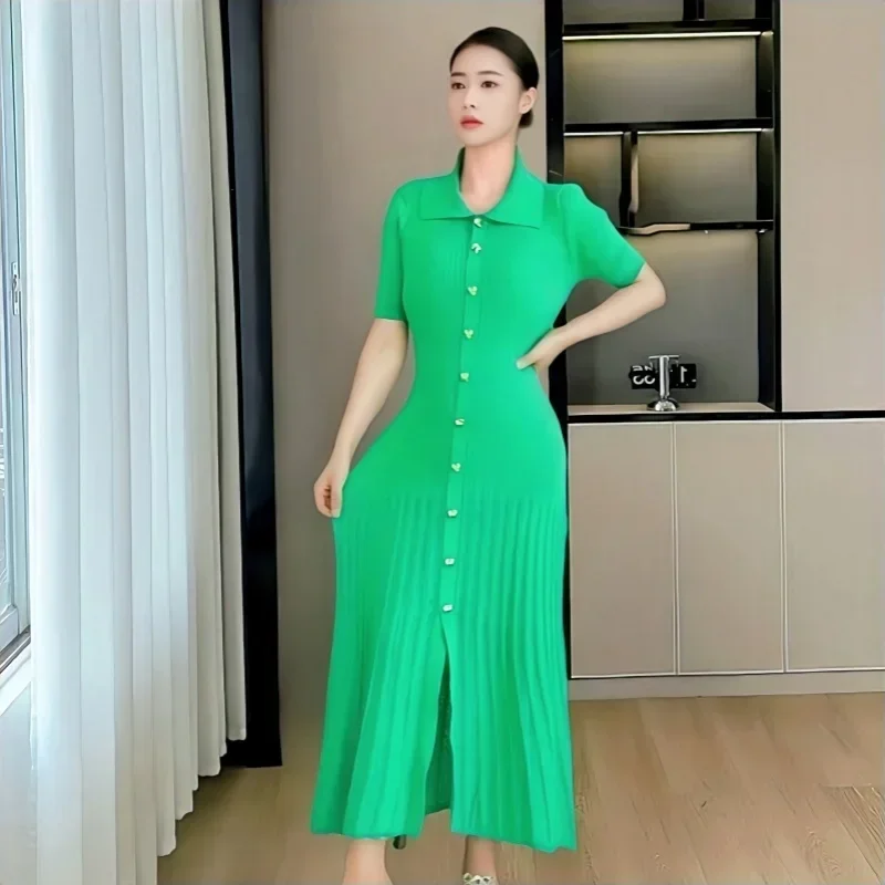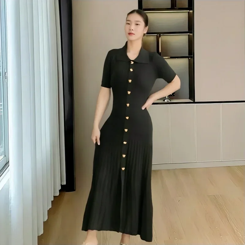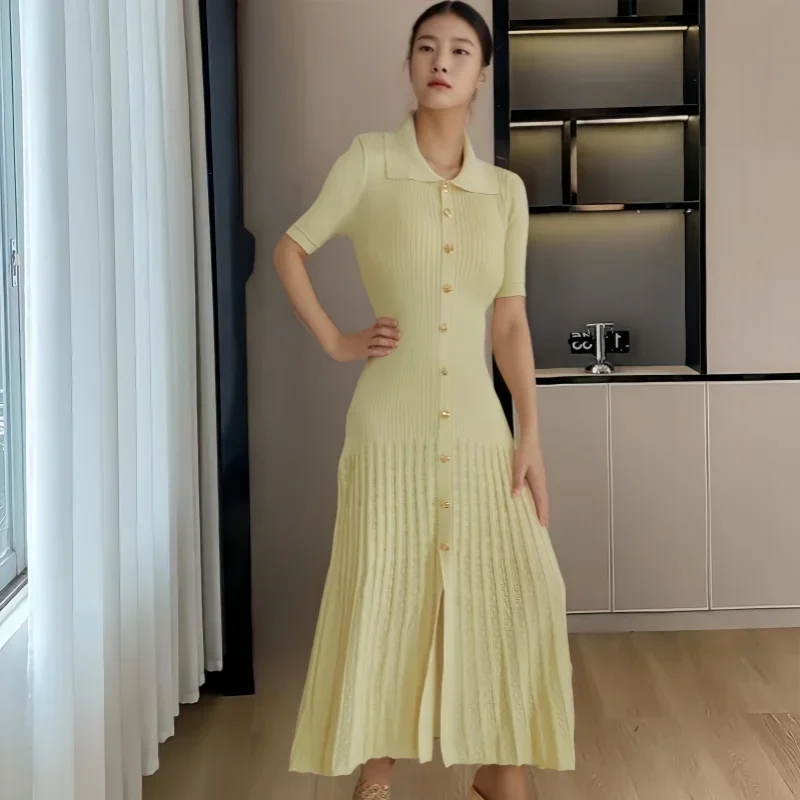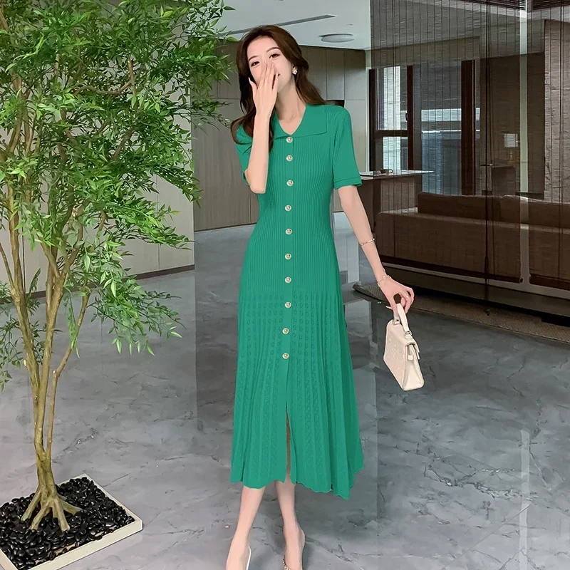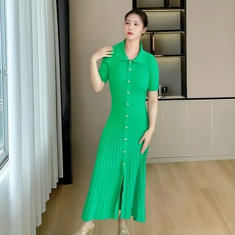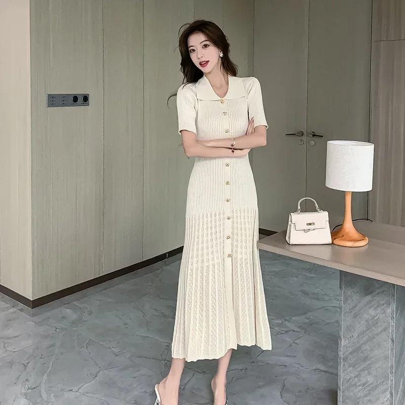 2025 New Fashion Summer Single Breasted Knitted Long Dress Women Lapel Short Sleeve Stretch Hollow Out Split Pleated Vestidos