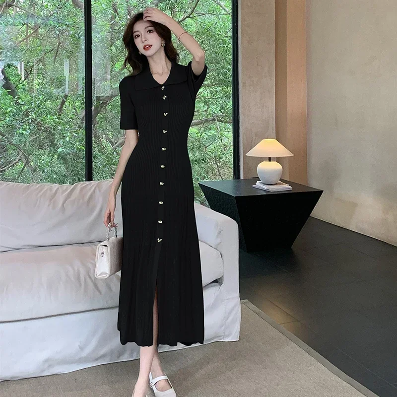 Be the first to review “2025 New Fashion Summer Single Breasted Knitted Long Dress Women Lapel Short Sleeve Stretch Hollow Out Split Pleated Vestidos”