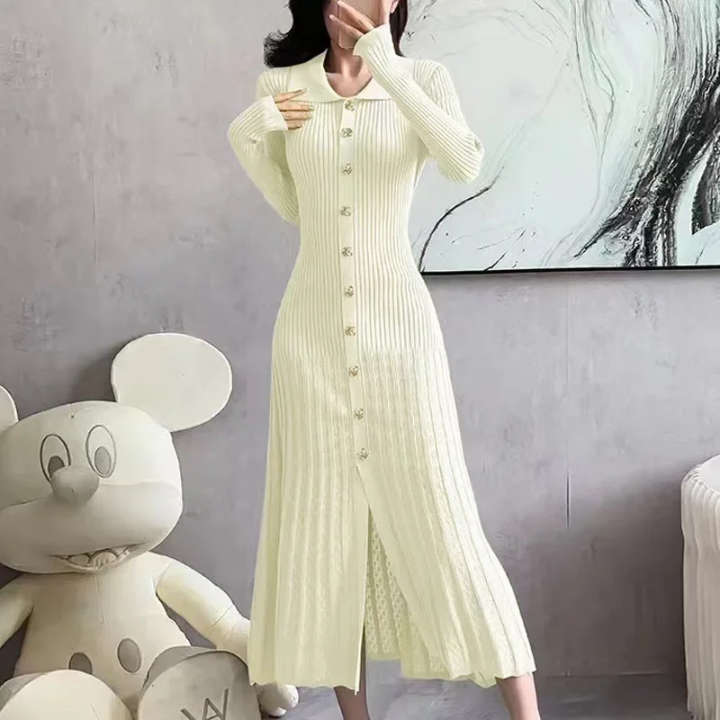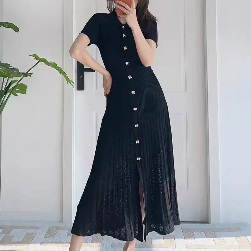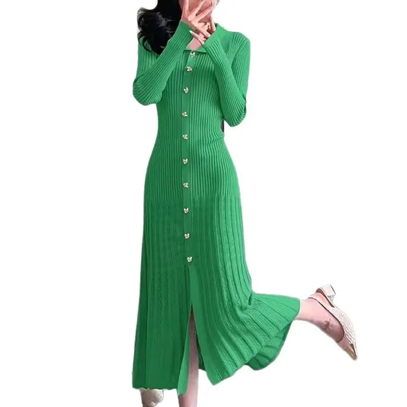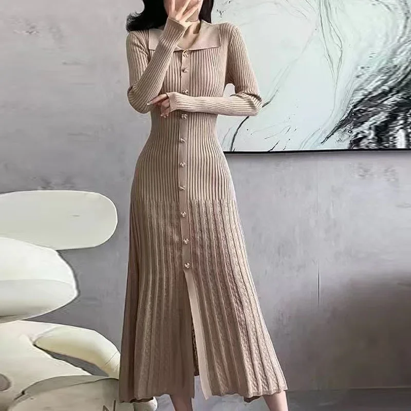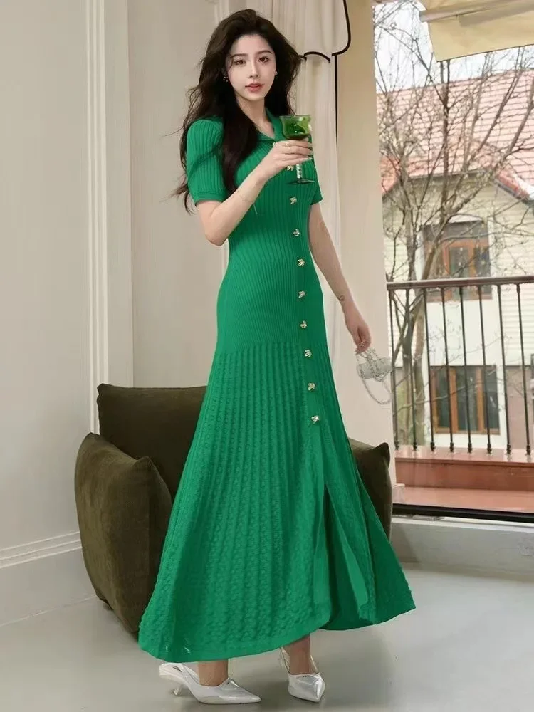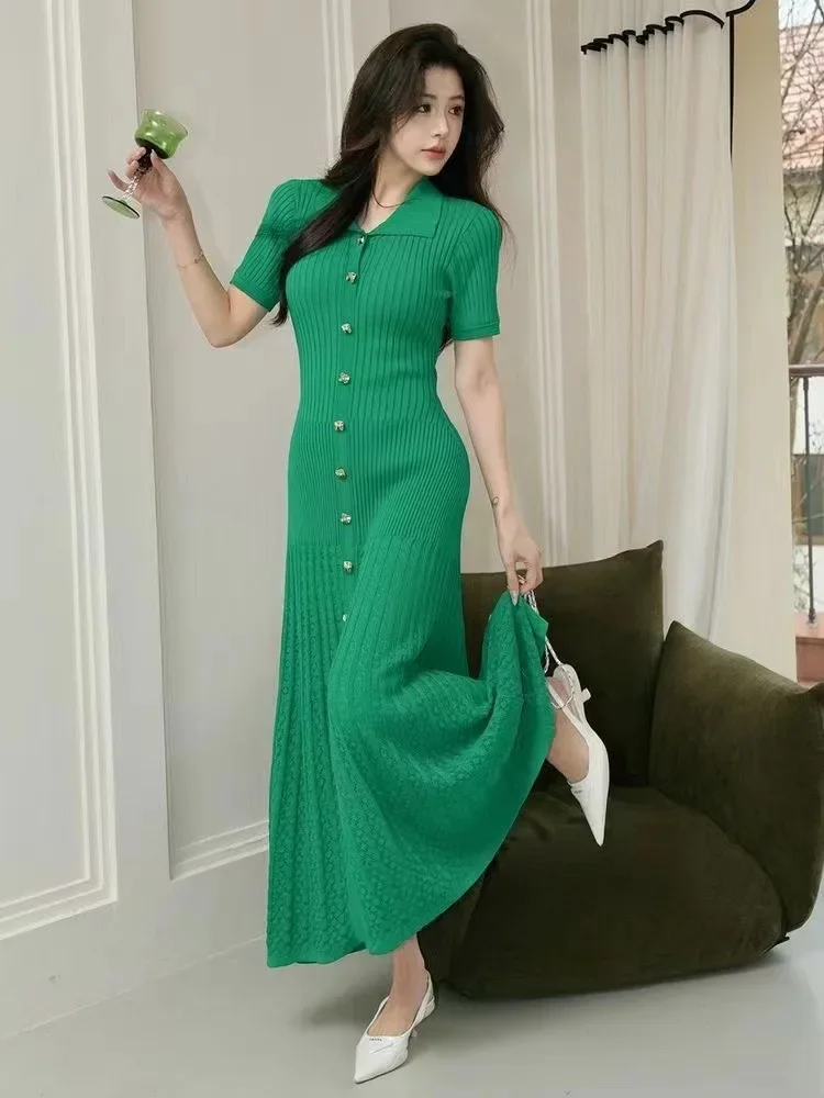 Cross-Border New Style Polo Collar Knitted Dress Commute Vintage Design Sense Slit Long Skirt Regular Sleeve Length Short