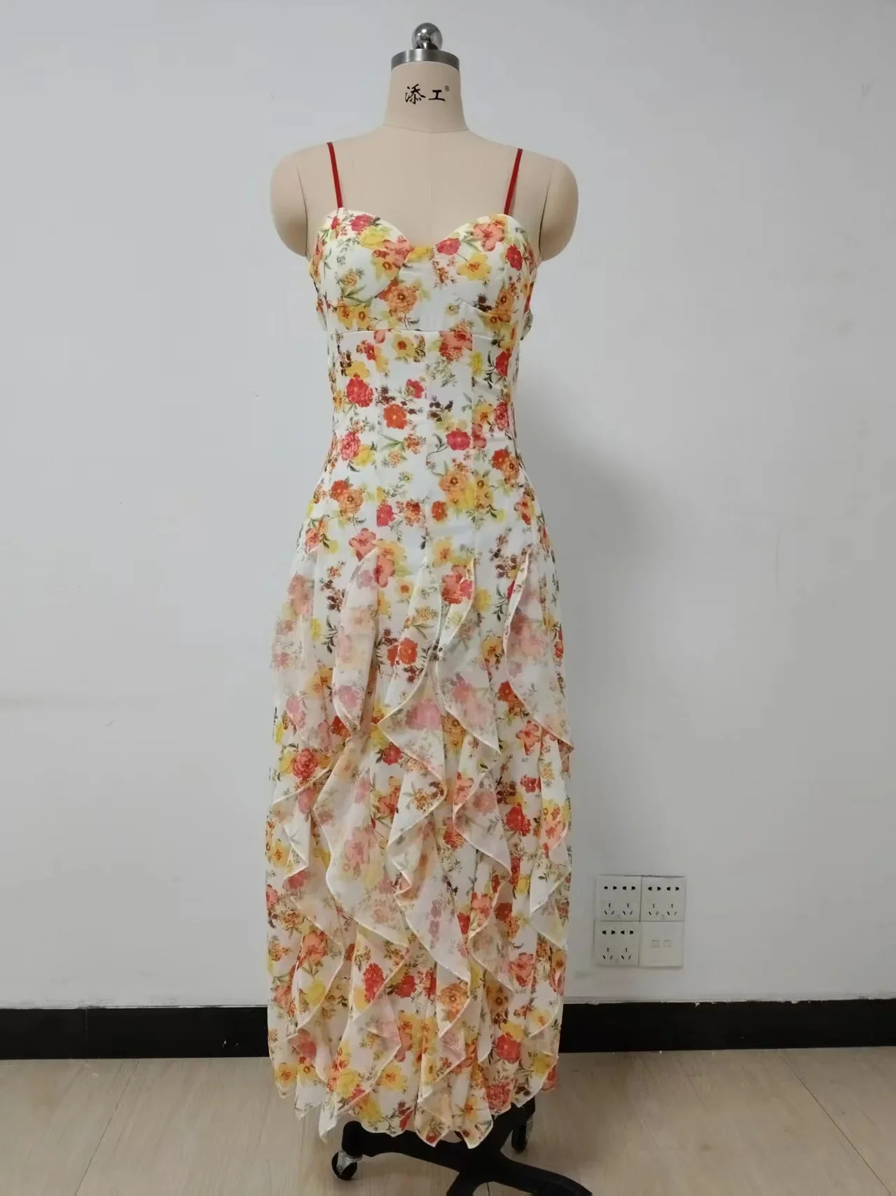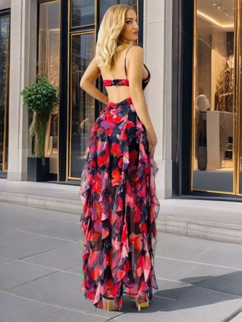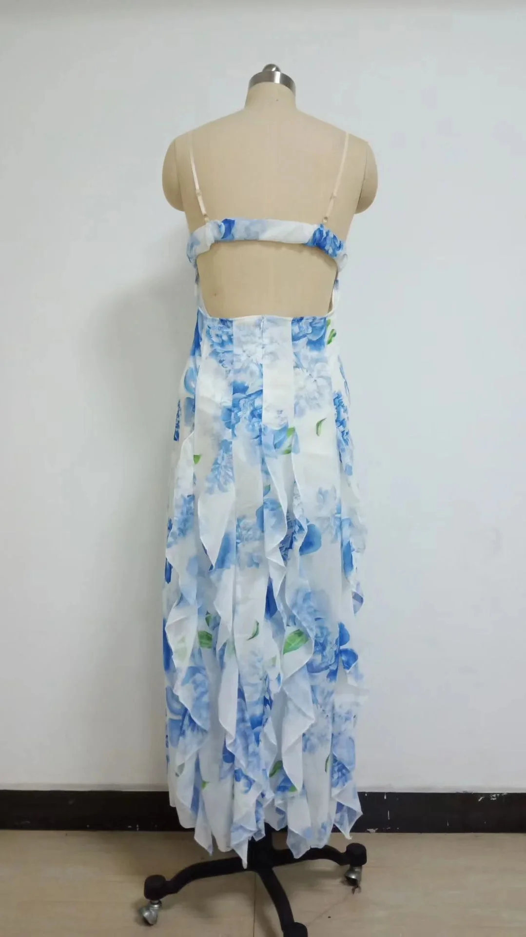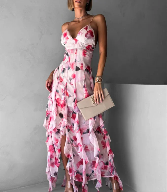 Elegant Chiffon Floral Print Cami Dress With Ruffled Hem Sexy V Neck Backless Cami Dress Summer Fashion Women’s Vacation Dress
