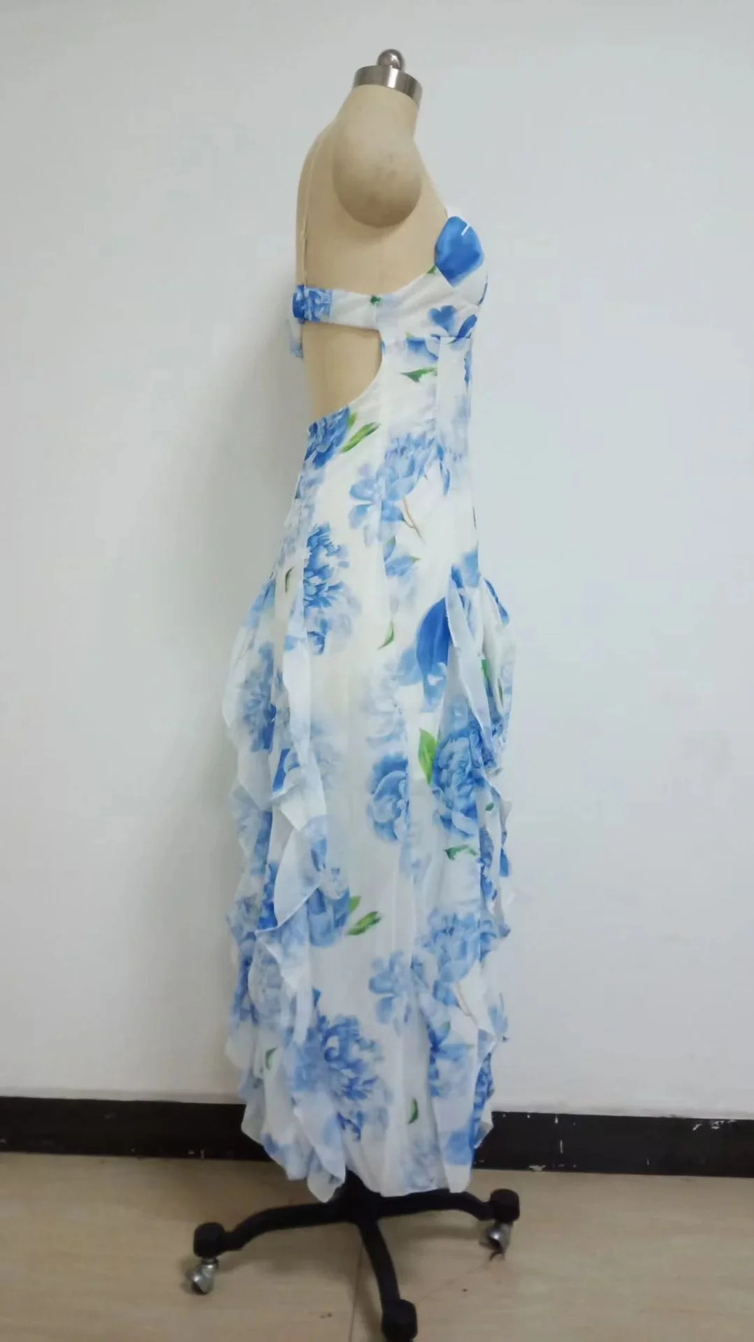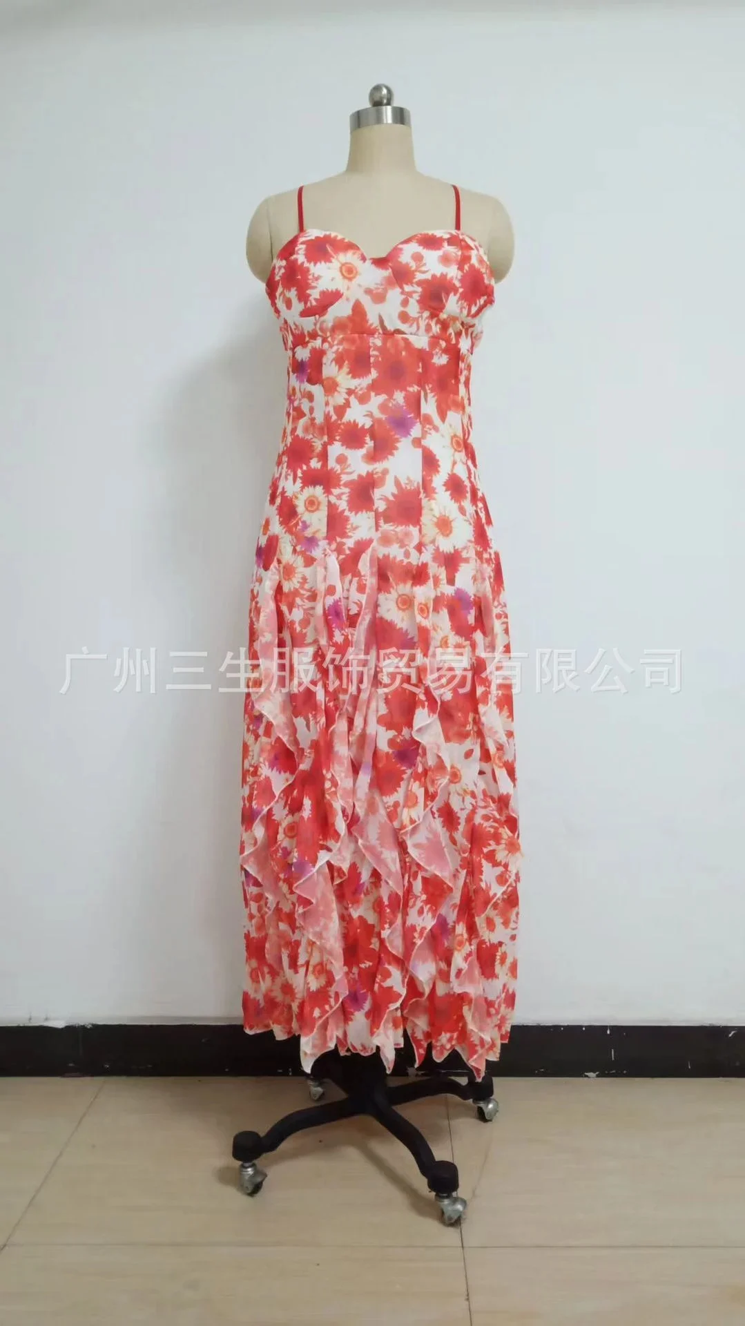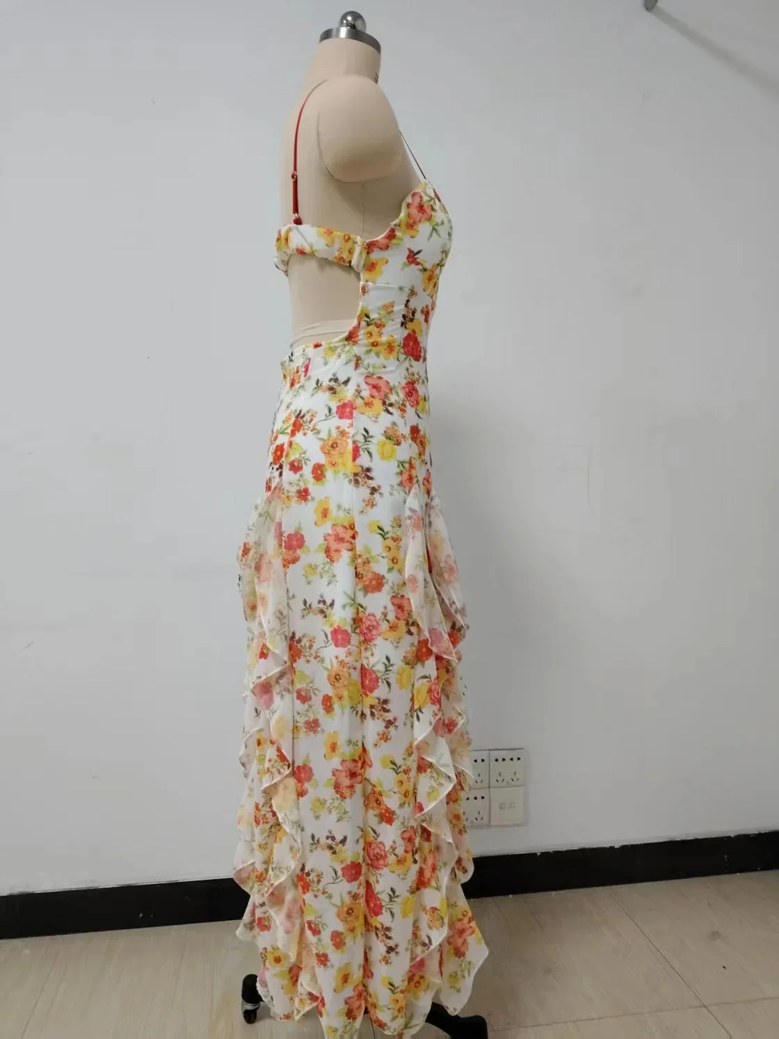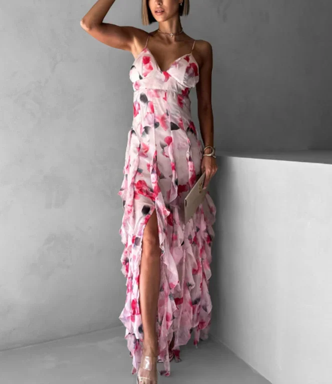 Elegant Chiffon Floral Print Cami Dress With Ruffled Hem Sexy V Neck Backless Cami Dress Summer Fashion Women’s Vacation Dress