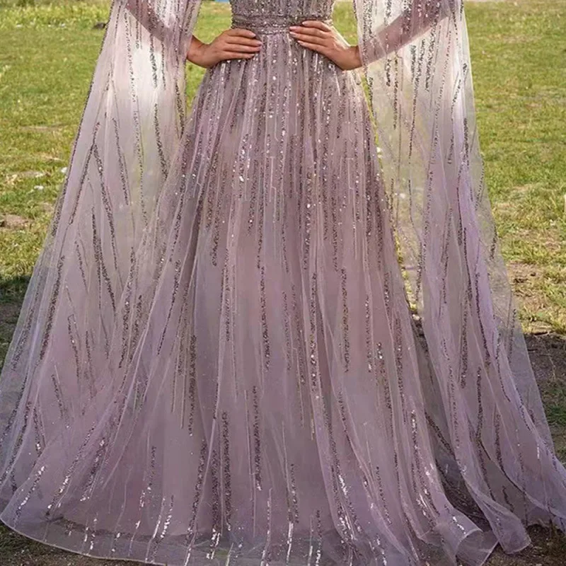 Elegant Tulle Long Evening Dress A-Line High Neck Floor Length Sequin Flying Sleeves Wedding Guest Dresses 2025 Free Customized