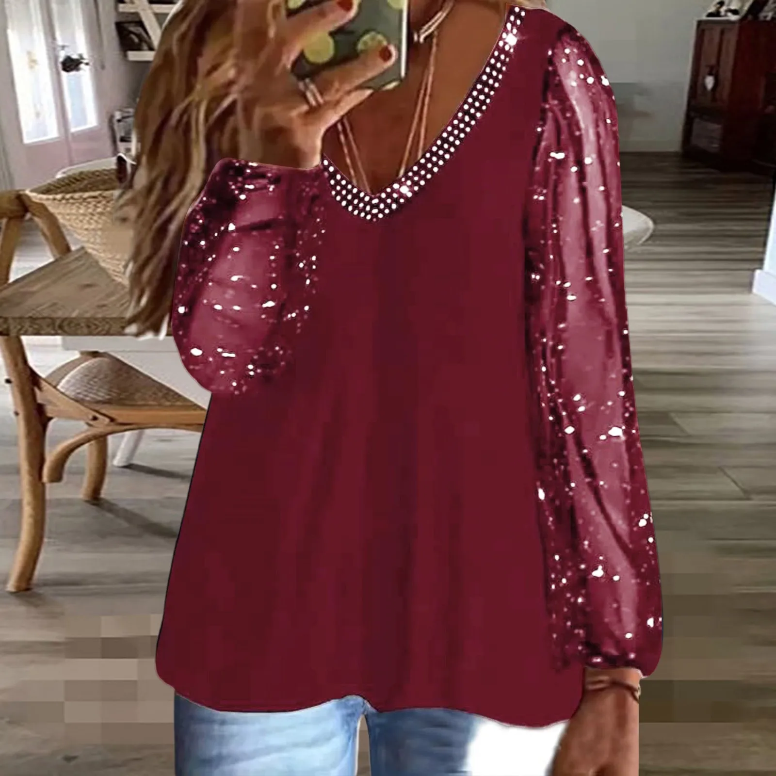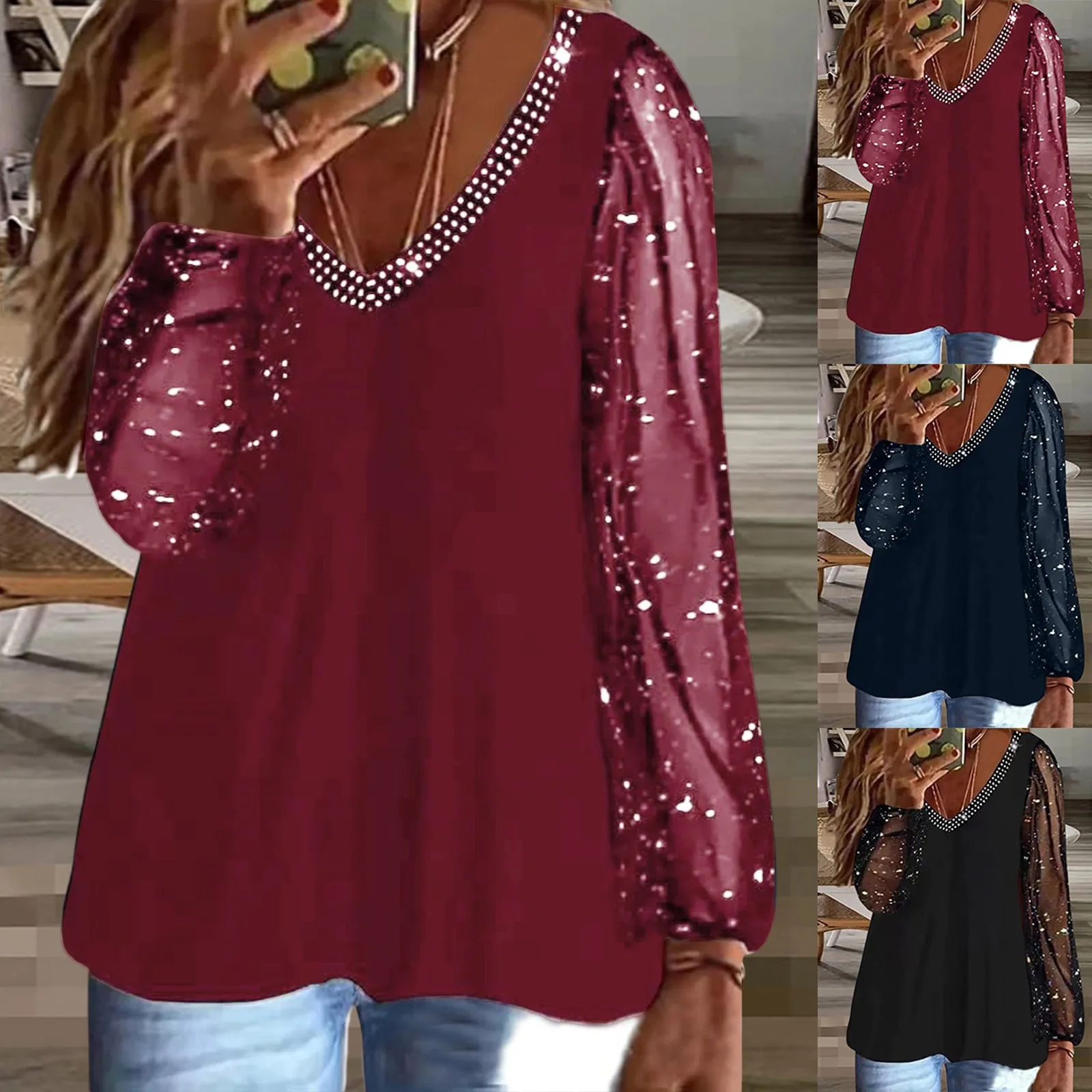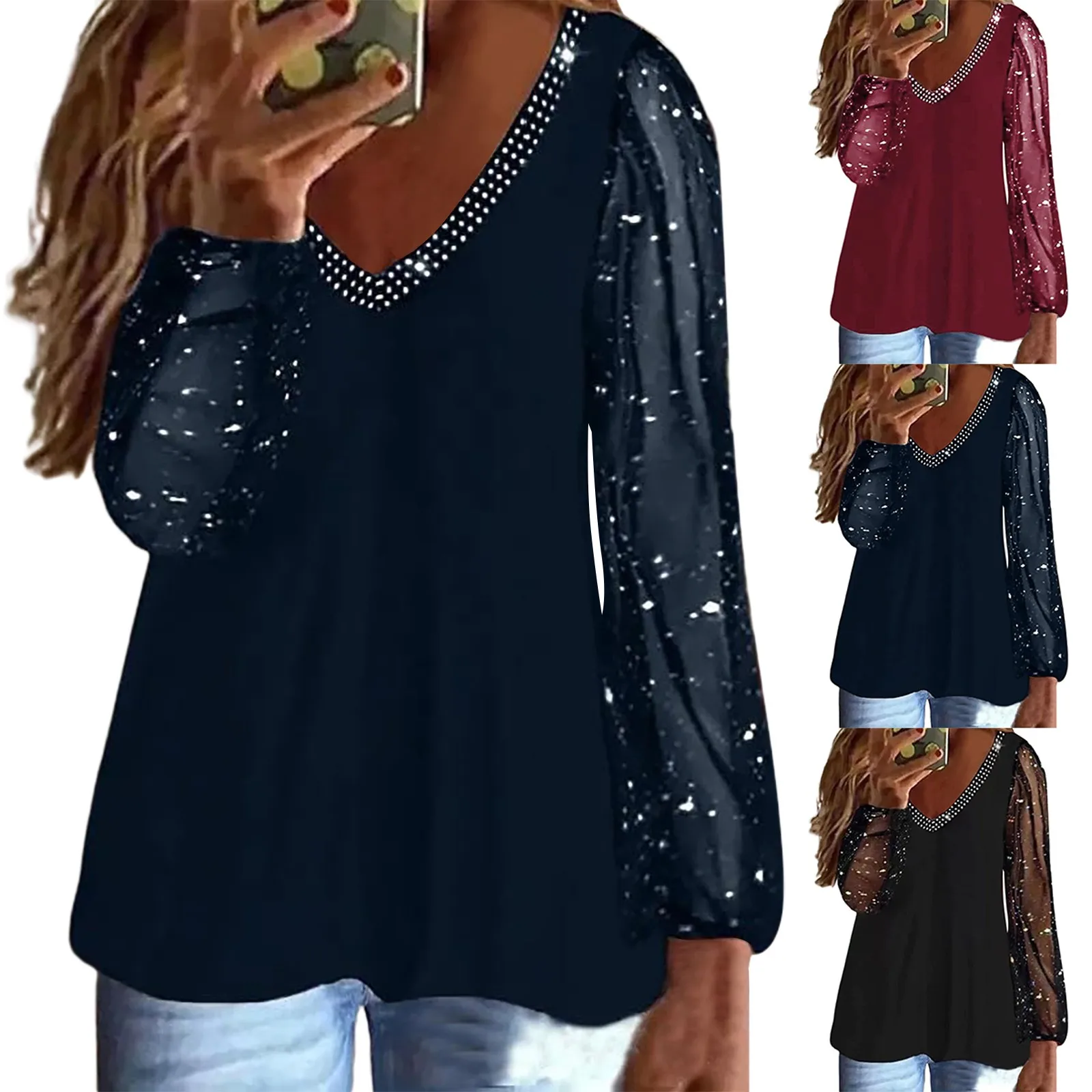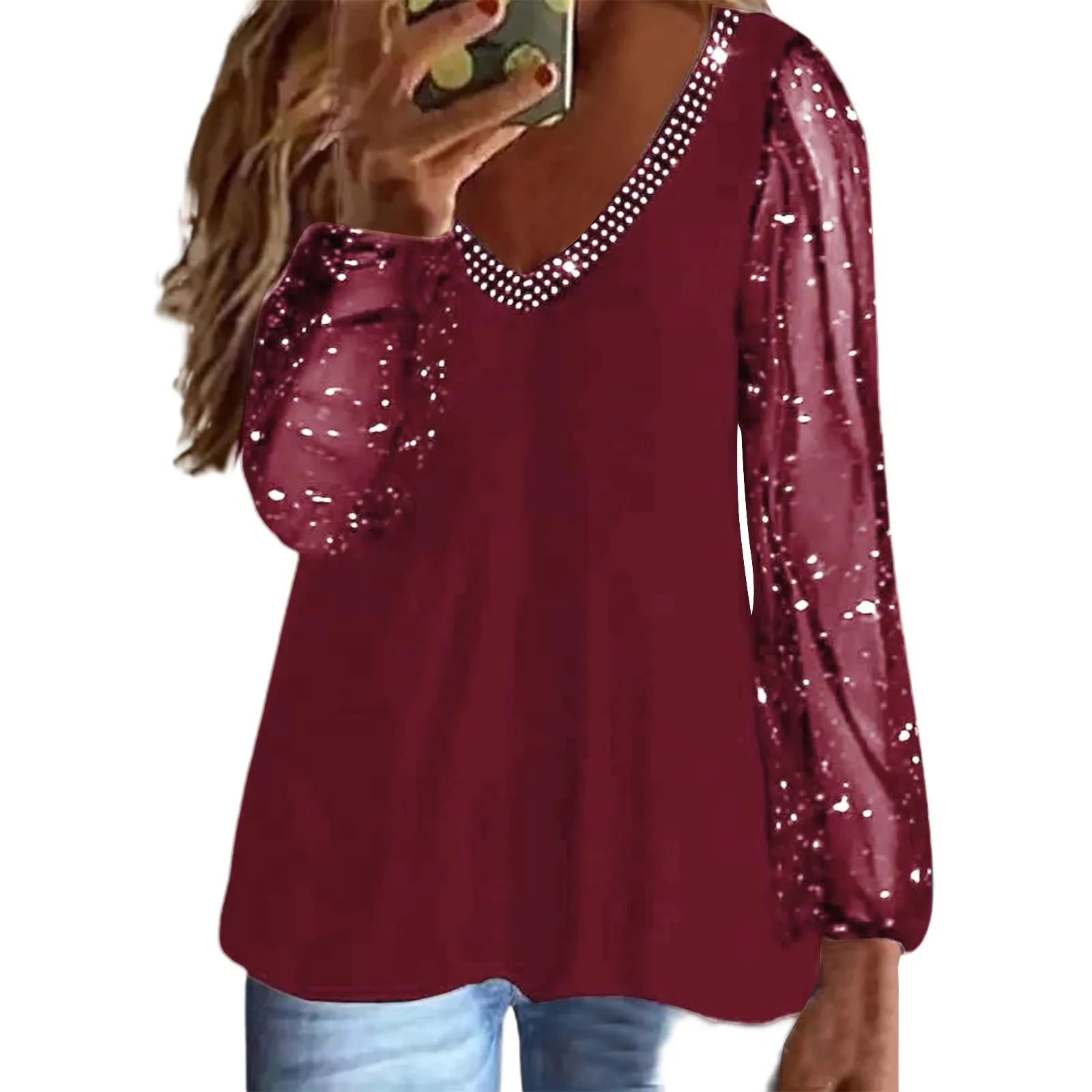 Women Casual Plus Size Solid T Shirt Long Sleeve V Neck Shirt Fit Blouse Loose Tops