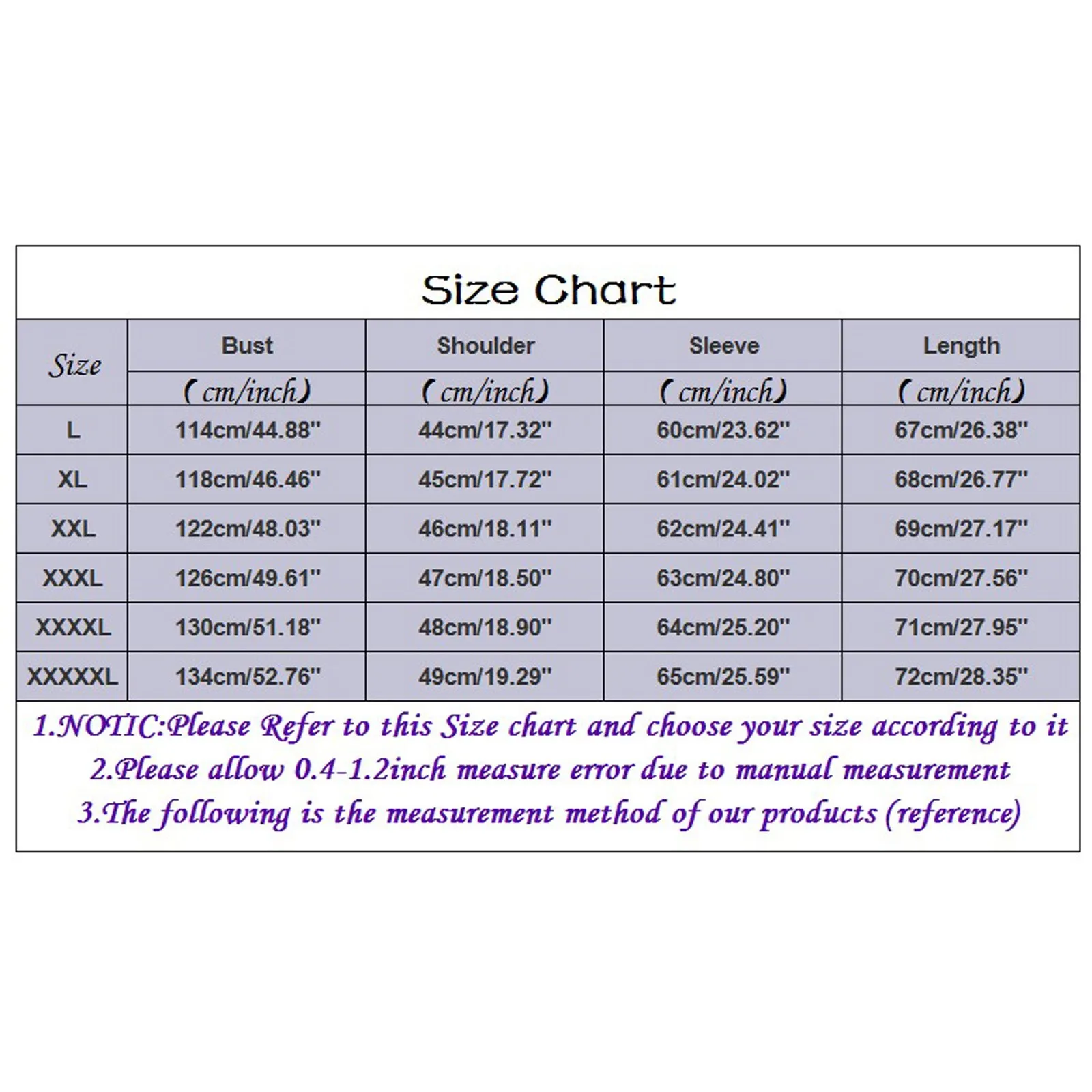 | Size:XXXXXL | Bust:134cm/52.76” | Shoulder:49cm/19.29” | Sleeve:65cm/25.59” | Length:72cm/28.35” |