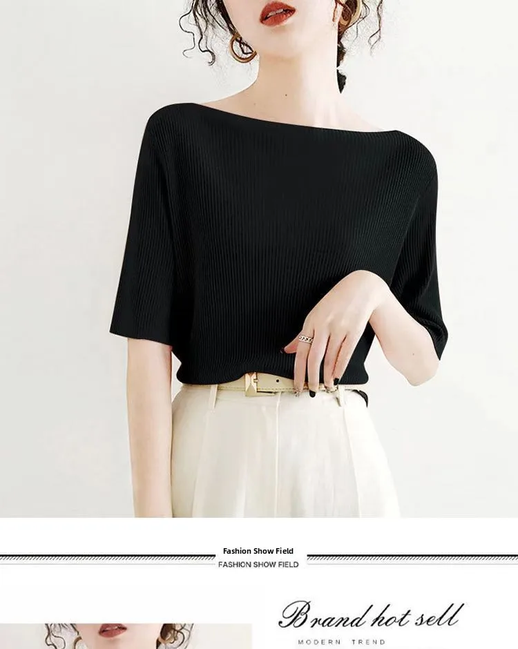 Korean Style Off-Shoulder Ice Silk Knitted Top Women’s Inner Wear Gentle Five-Sleeve Design Sensation Small Audience
