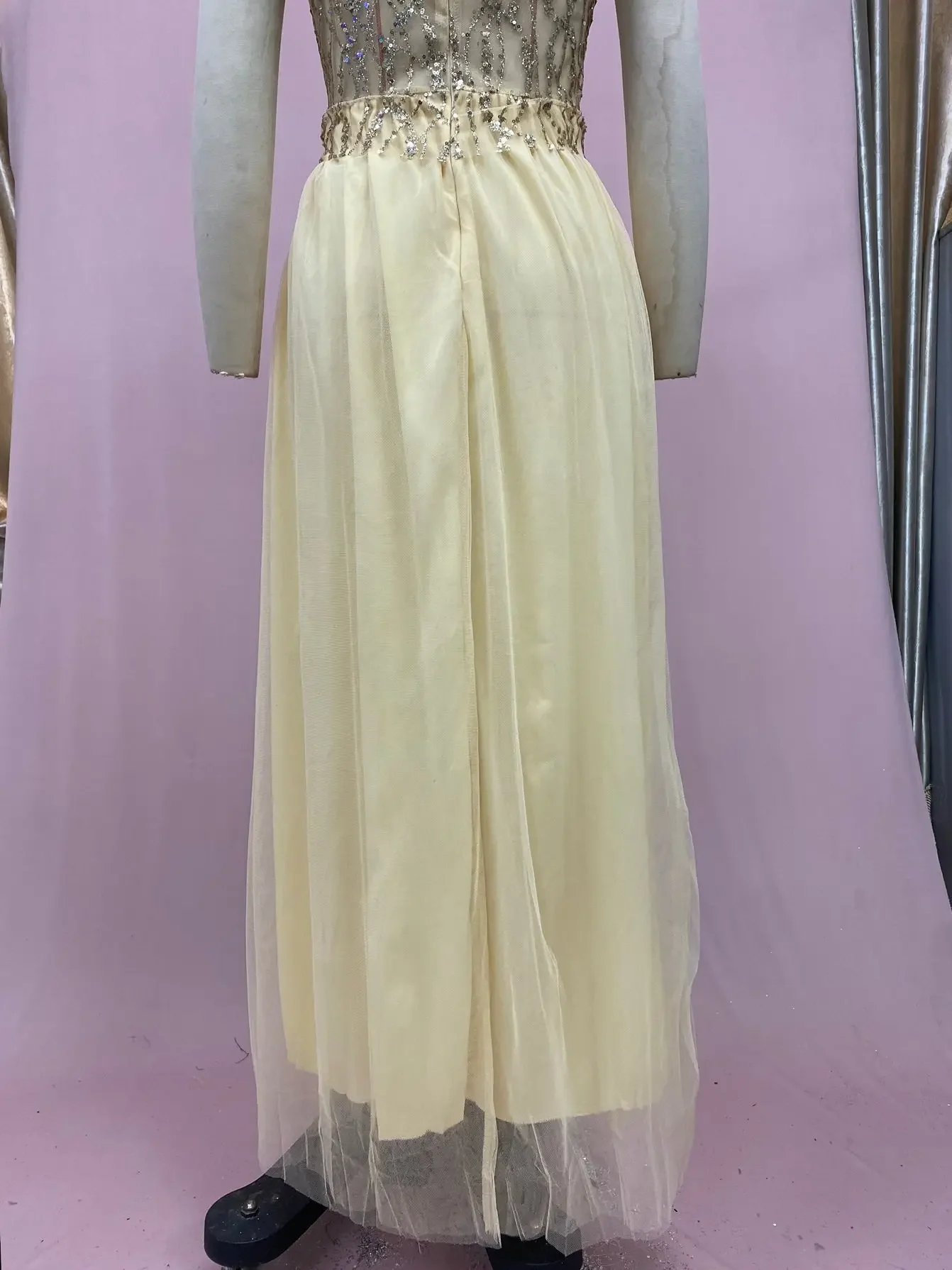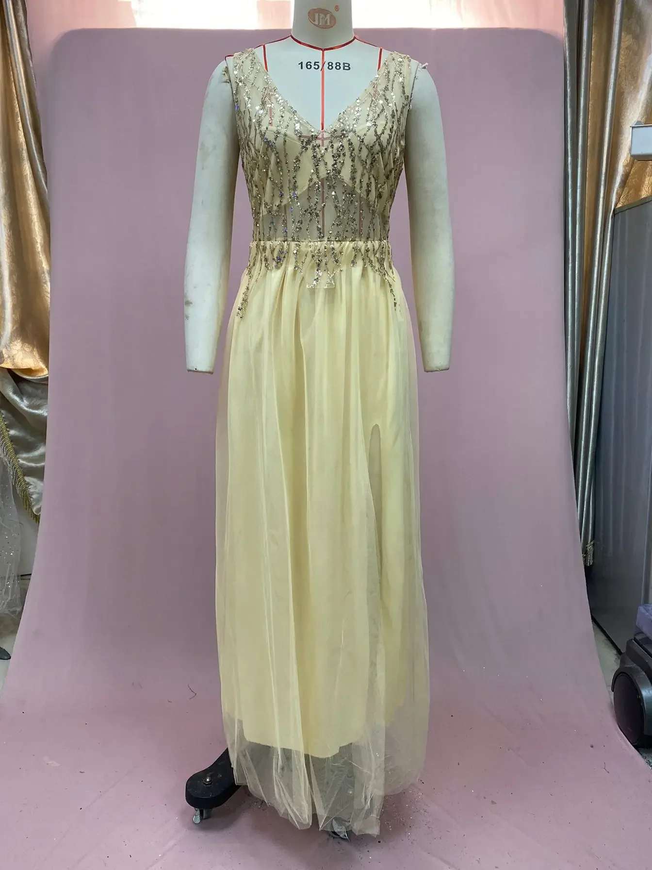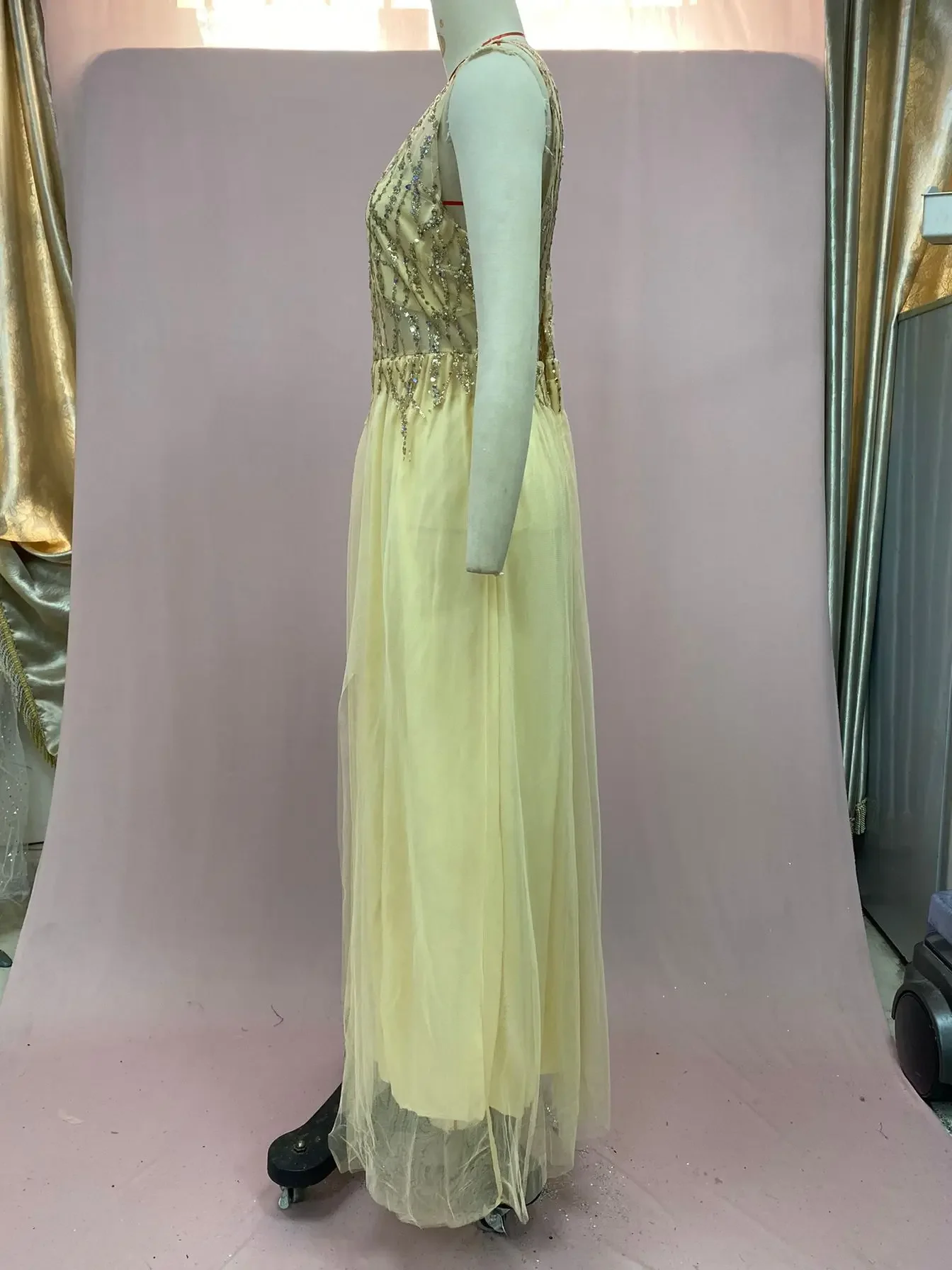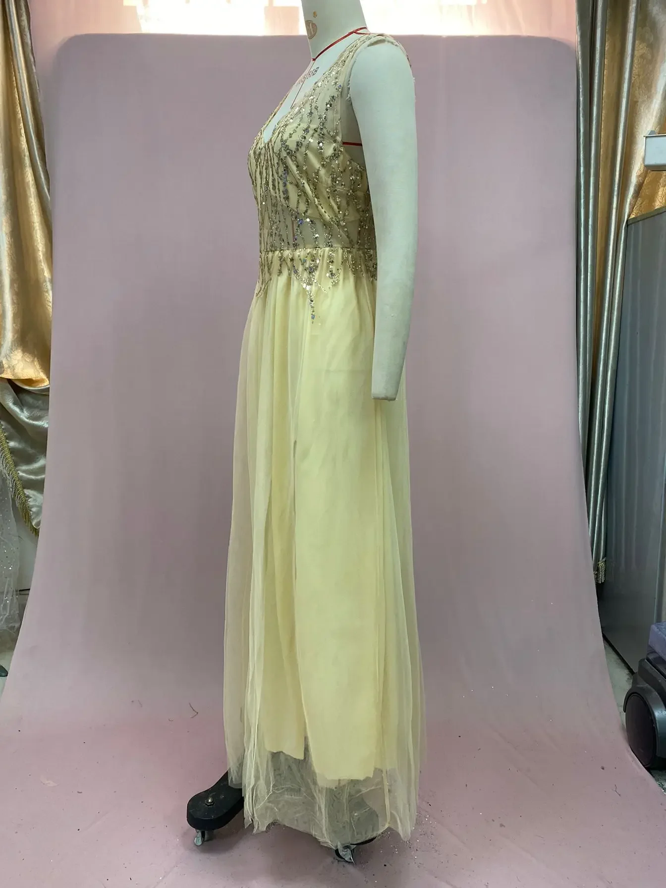 Shiny Gold V-Neck Patchwork Evening Dress Summer 2024 European And American Style Sleeveless Party Dress For Women