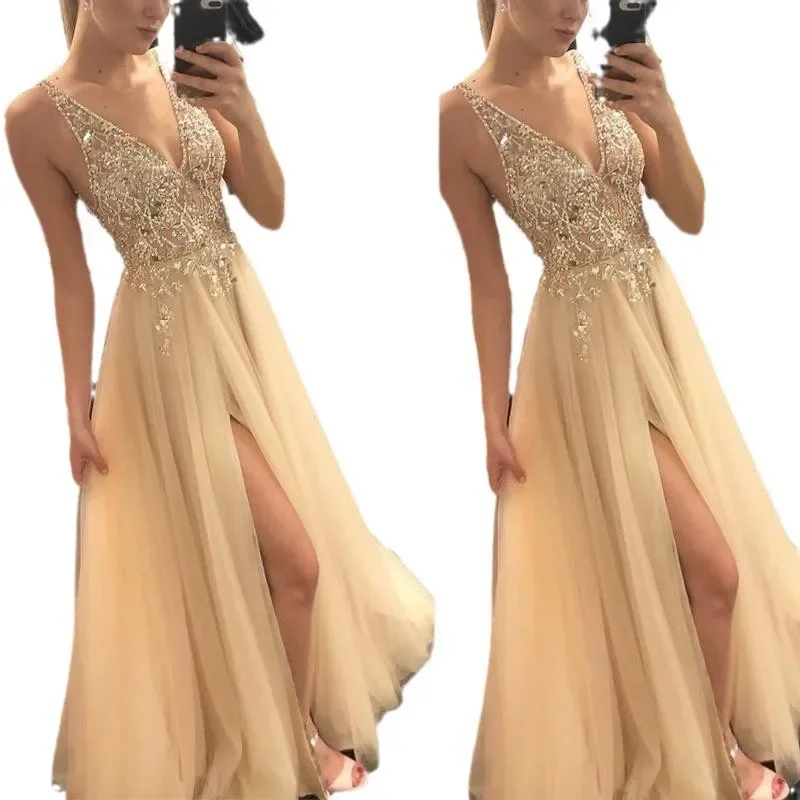 Be the first to review “Shiny Gold V-Neck Patchwork Evening Dress Summer 2024 European And American Style Sleeveless Party Dress For Women”