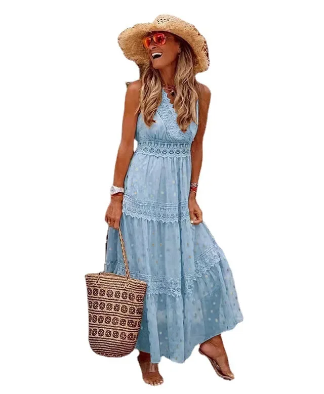 Summer New Women’s Sexy Deep V Sleeveless Chiffon Dress Patchwork Midi Skirt Fashionable Elegant Women’s Clothing
