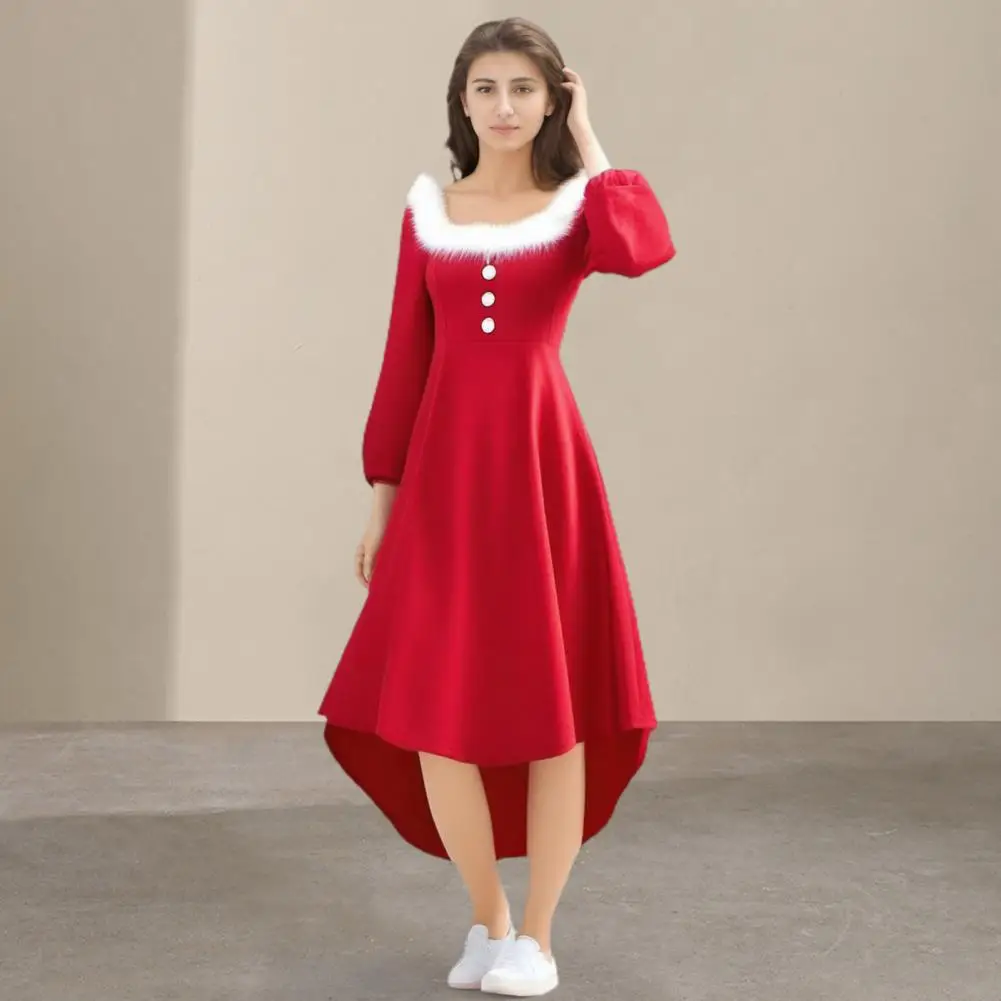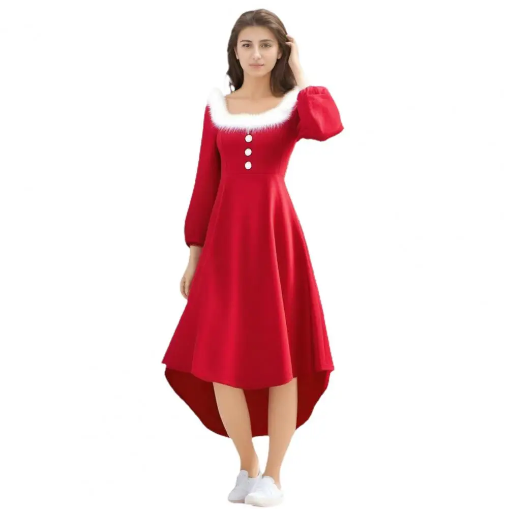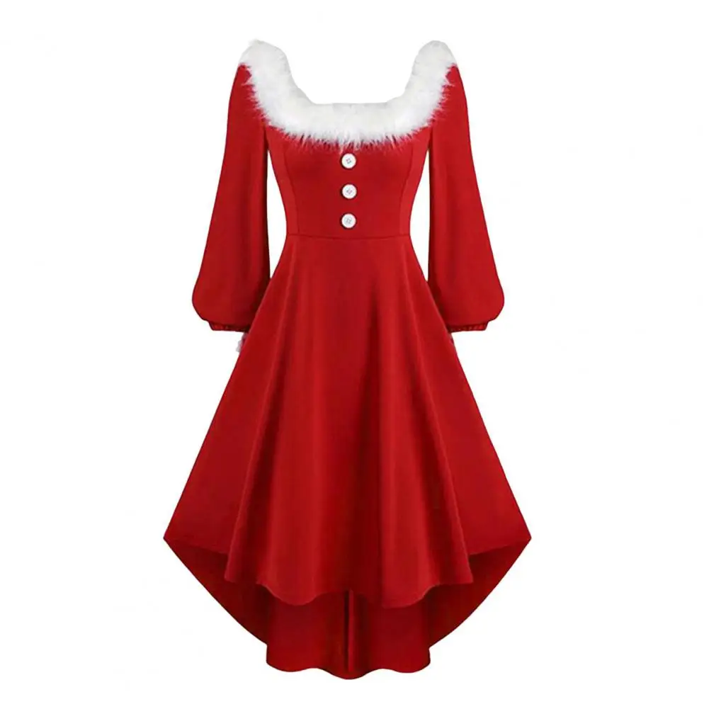 Christmas Performance Dress Fluffy Square Neck Pure Color A-line Irregular Hem Button Decor Festive Stage Show Santa Cosplay Costume New Year Party Maxi Dress