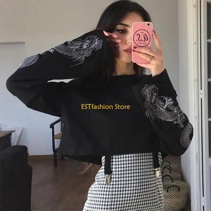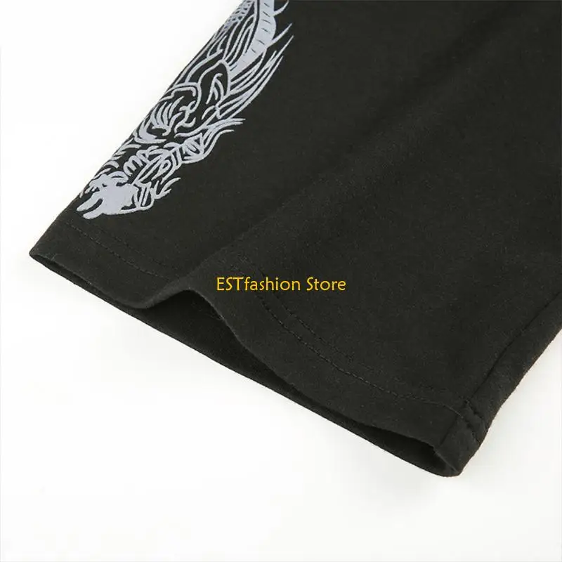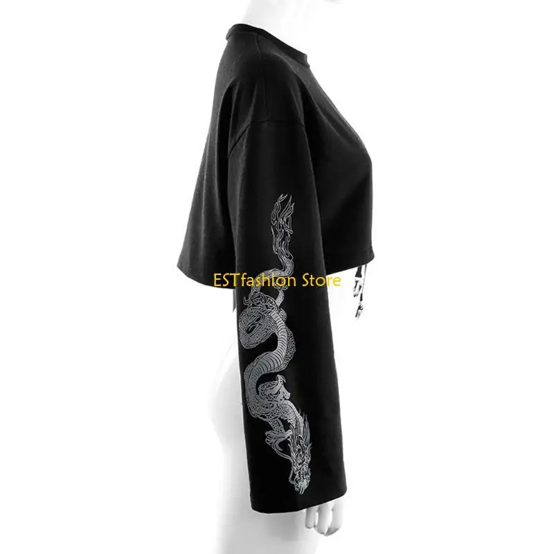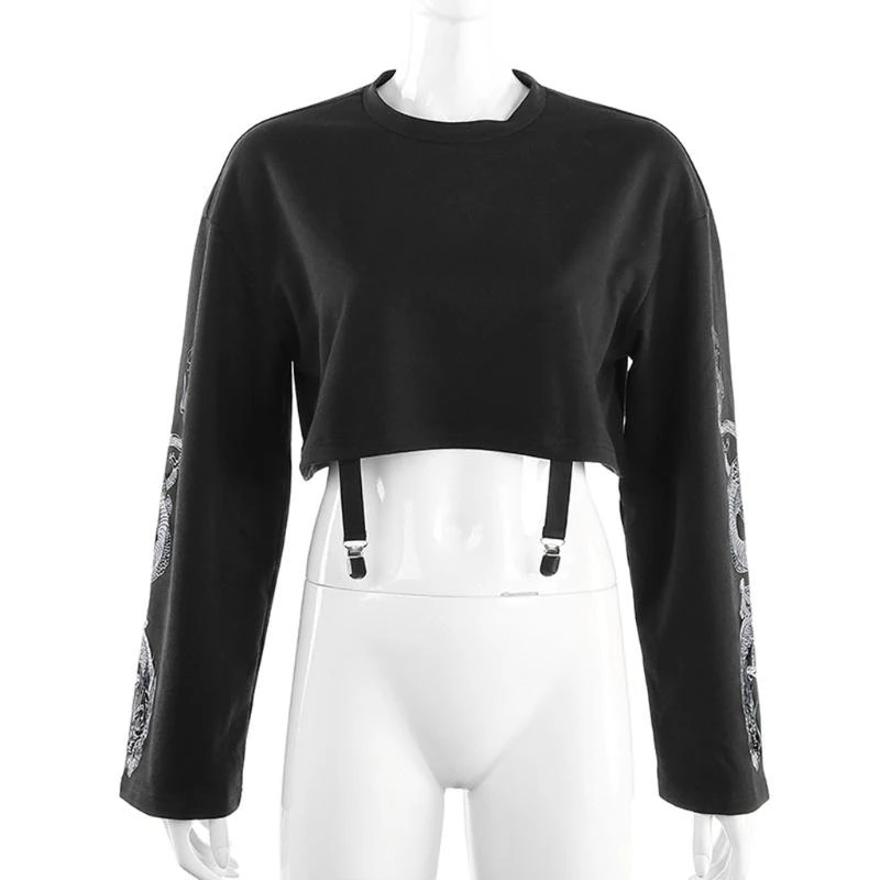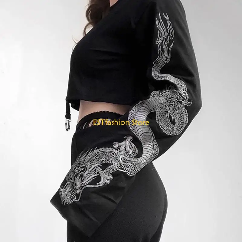 Harajuku gothic punk dragon patterns printed at both sleeves, metal clip at hem.