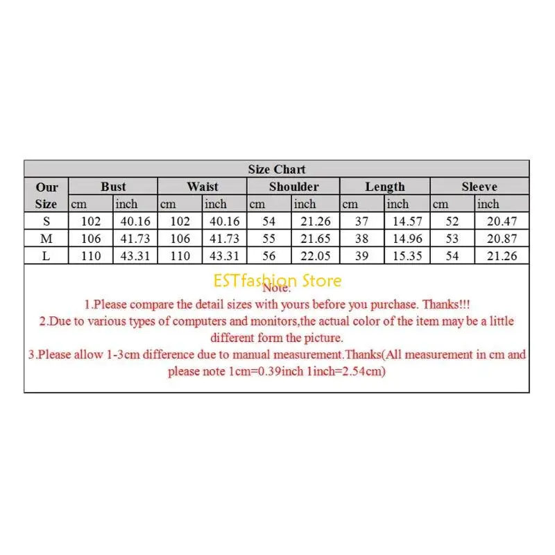 Size:L Bust:110cm(43.31inch) Waist:110cm(43.31inch) Shoulder:56cm(22.04inch) Length:39cm(15.35inch) Sleeve:54cm(21.25inch)